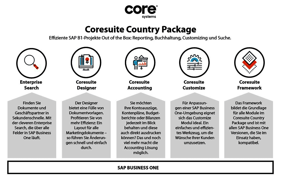 Das coresuite country package beinhaltet die wichtigsten coresuite Standard Apps für SAP Business One sowie länderspezifischen Erweiterungen wie zum Beispiel Marketing Layouts und Finanzberichte für SAP Business One, die ERP Lösung für klein und mittelständische Unternehmen.