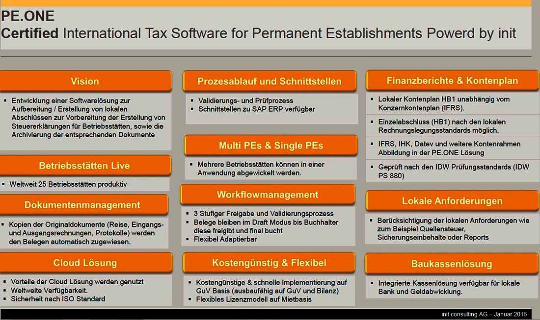 Gemeinsam mit der Siemens AG hat die init Consulting AG mit Sitz in Ingolstadt eine Softwarelösung auf Basis des AOA (Authorized OECD Approach) & des BsGaV für deren Betriebsstätten entwickelt. Die Lösung beinhaltet alle steuerrechtlich relevanten Anforderungen um einen Steuerabschluss der Betriebsstätte kostengünstig & schnell abwickeln zu können.